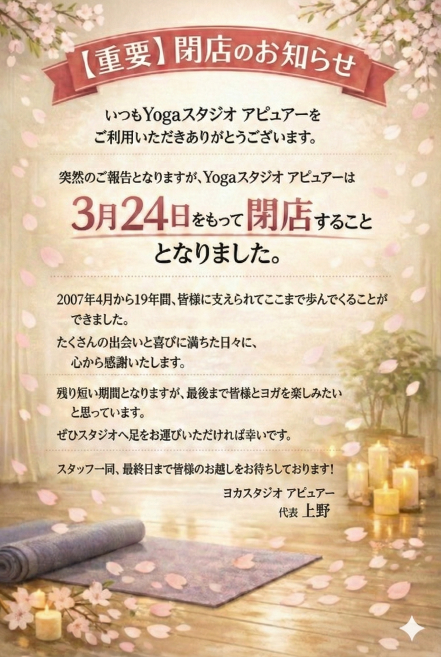 このたび、ヨガスタジオを閉館することとなりました。